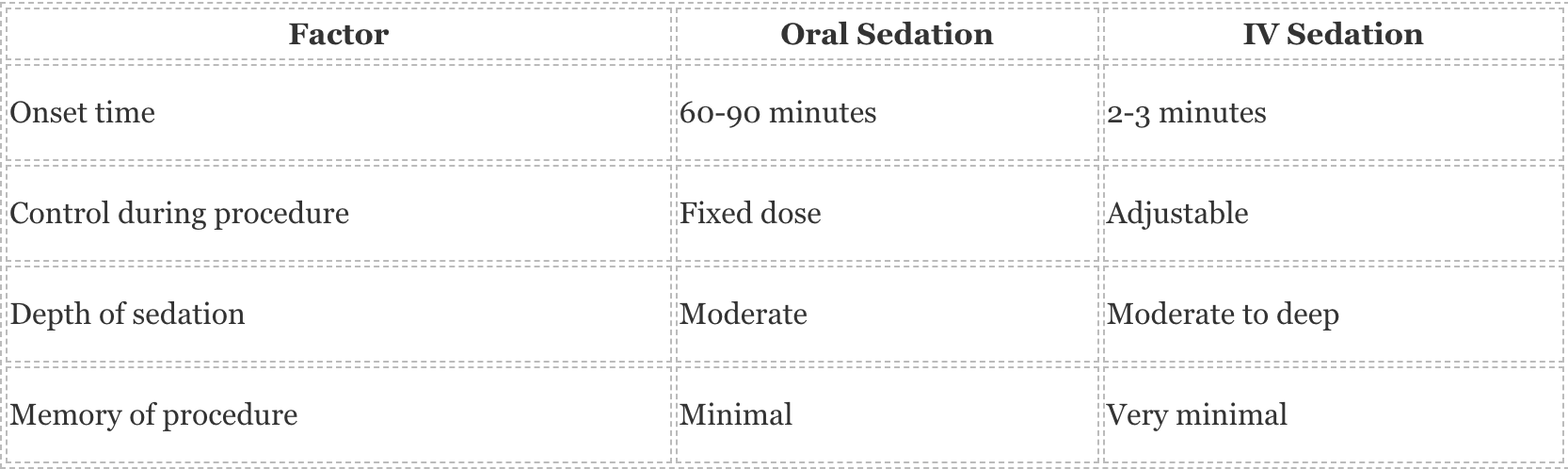 IV sedation works faster, usually within 30-60 seconds. It creates moderate to deep sedation depending on the medication dosage.
