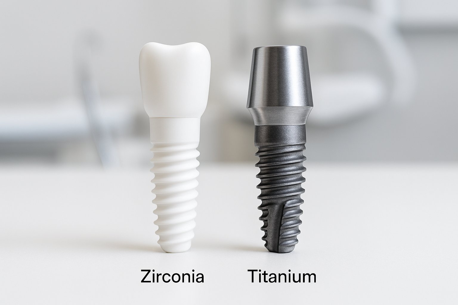 Titanium has decades of research backing its use. Zirconia offers a metal-free option for patients with sensitivities.